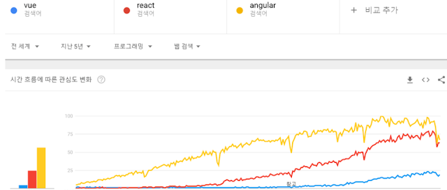 현재 Vue는 다른 프레임워크들 ( react: Facebook, angular: Google ) 과 어깨를 나란히 견줄 수 있을만큼 무섭게 성장하는 프레임워크입니다.