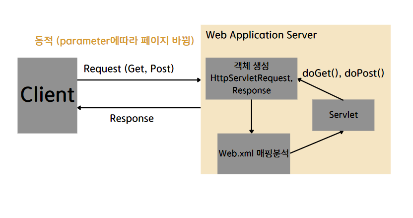 위 그림에서 web.xml을 기반으로 들어온 URL이 어느 서블릿에 해당하는지 매핑 분석을 시도합니다. 그 후 찾은 서블릿을 기반으로 서블릿에서 서비스를 호출한 후, 서비스에서는 doGet(), doPost()를 호출합니다. 해당 메서드에서 동적 페이지 생성 후 객체에 응답을 보냅니다.
