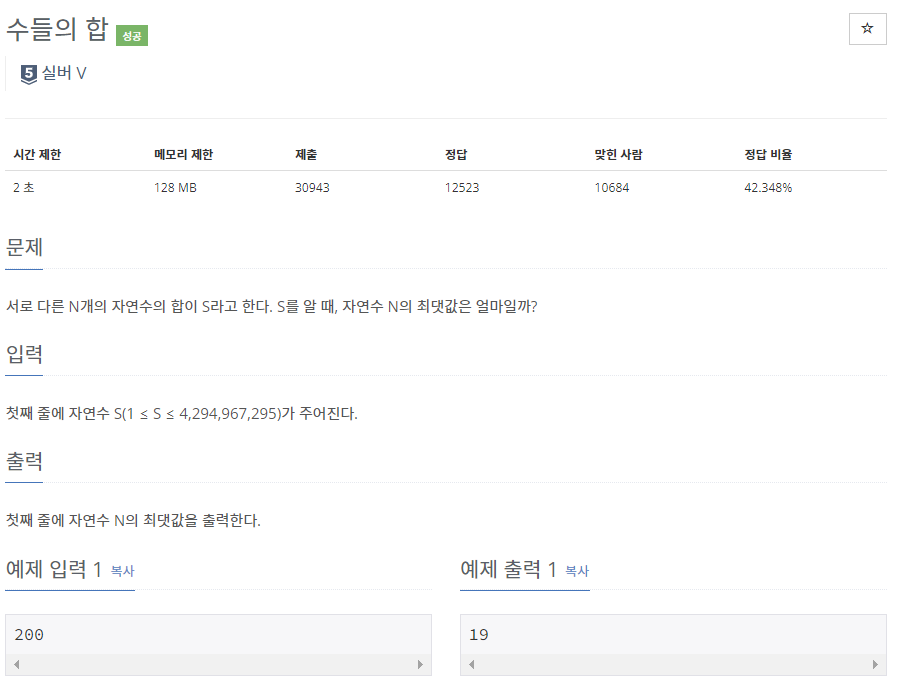 📌 백준 1789번 수들의 합