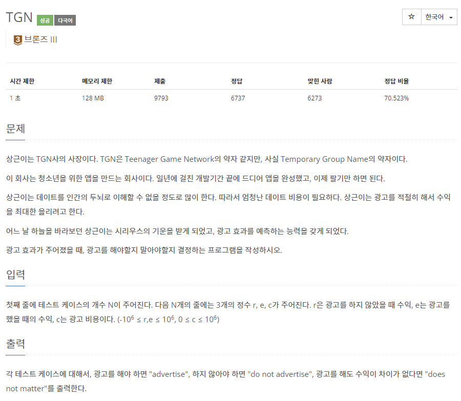 📌 백준 5063번 TGN