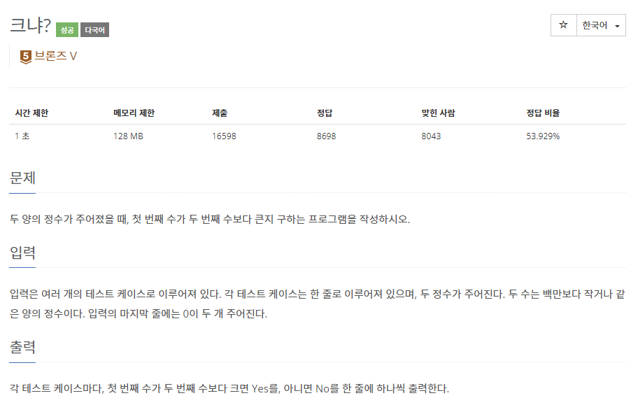 📌 백준 4101번 크냐?