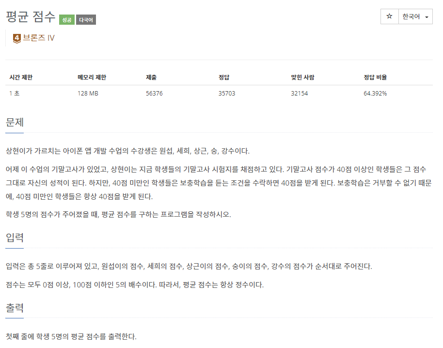 📌 백준 10039번 평균 점수