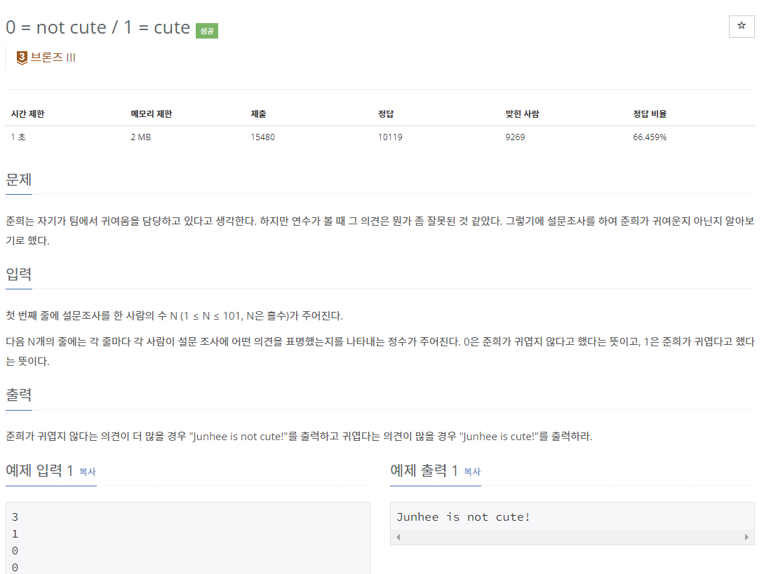 📌 백준 10886번 0 = not cute / 1 = cute