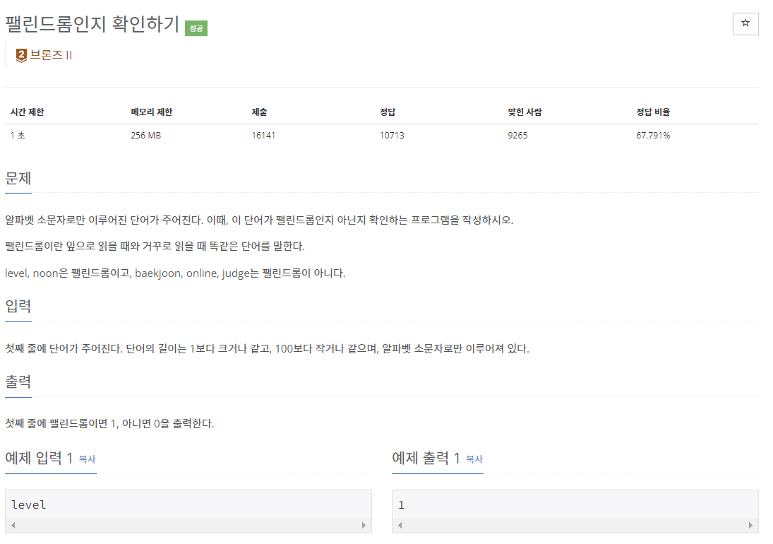 📌 백준 10988번 팰린드롬인지 확인하기