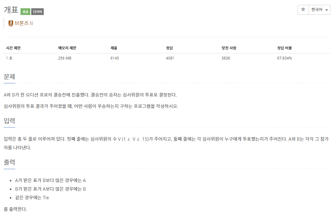 📌 백준 10102번 개표
