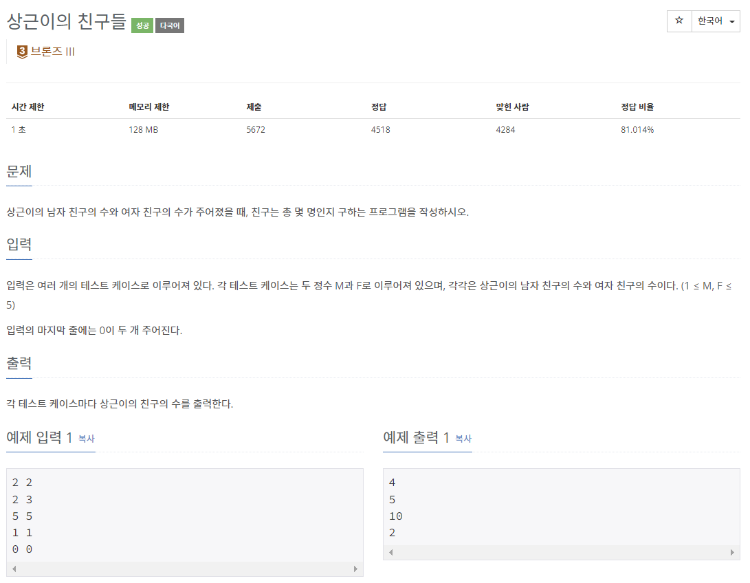 📌 백준 5717번 상근이의 친구들