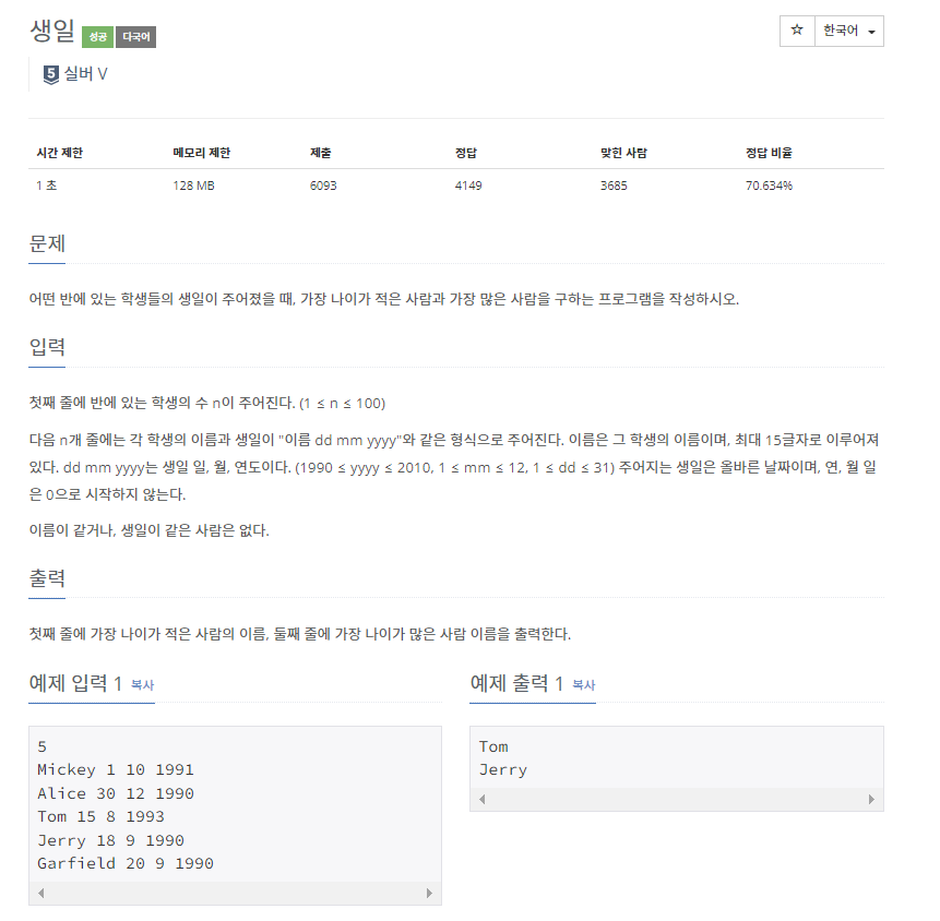 어떤 반에 있는 학생들의 생일이 주어졌을 때, 가장 나이가 적은 사람과 가장 많은 사람을 구하는 프로그램을 작성하시오.