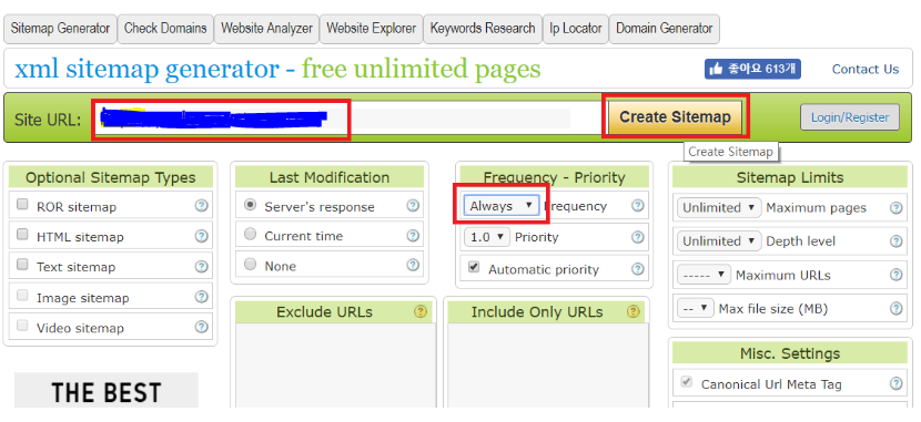 다음과 같이 사이트 URL주소를 입력하고 Frequency설정을 Always로 설정한 후에